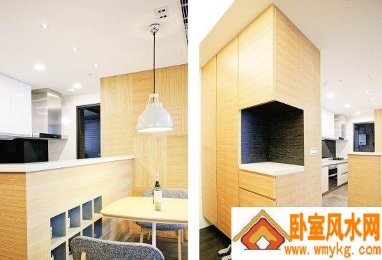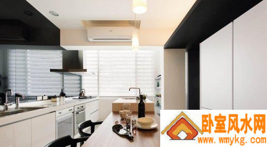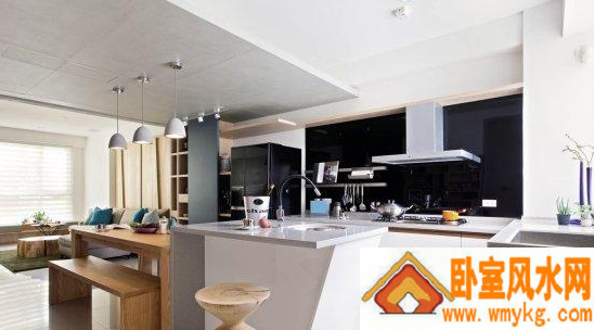 A一进门就看到厨房,是颇为常见的格局,一般小套房就是典型范例,有些大房子也会有这类格局。风水中认为,开门见灶易给人工作负担过重的感觉,会让人每天为生活而奔波,不过,透过室内设计规划,如厨具延伸略高吧台,或是利用隔屏、玄关柜等设计手法,可破解此一问题。