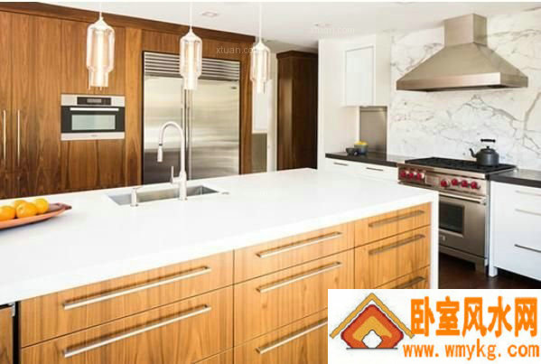 三、我们可以根据厨房自身的五行来确定厨房的颜色,我们知道厨房是火性的,所以用代表水性的蓝色和黑色会影响着厨房的健康风水。所以我们可以选择木和土这两个属性的颜色,即绿色和黄色。因为木生火,火又能生土,这样的橱柜风水能给厨房带来好运。