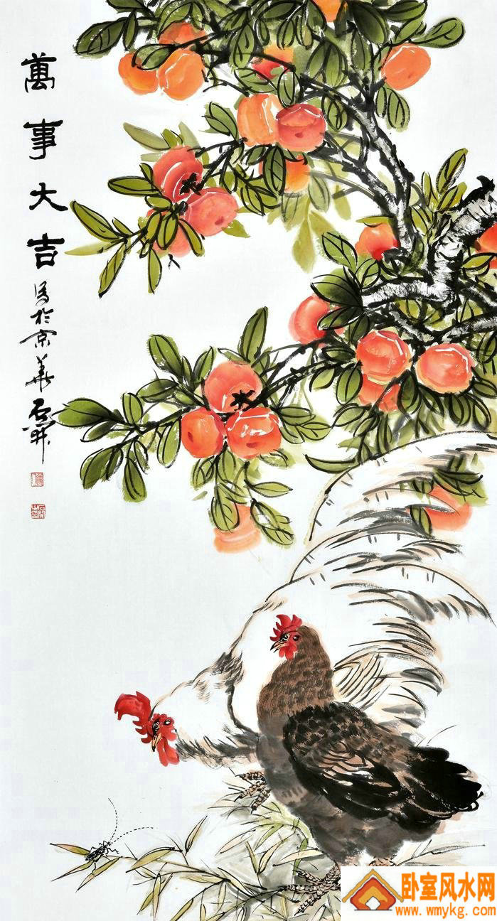 每到金秋时节,红红的“柿子”果就像红灯笼似的挂满枝头,国人的民族传统上都喜欢红色,红灯笼更是喜事与佳节庆典所不可或缺的,象征着日子火红,喜庆吉祥。石开老师这幅作品中,柿子树下,还画有两只象征着大吉大利的国画鸡,两种吉祥图案结合,有着“事事如意,大吉大利”的美好寓意。