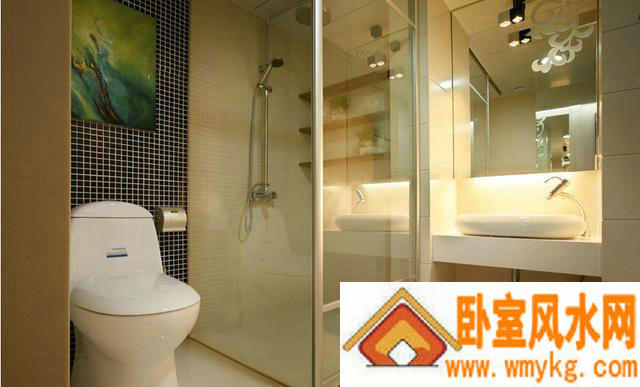 如果浴室没有对外的窗户,那堋可以在墙上挂面镜子以形成一个想像空间。,镜子能加速气能的流动,对浴室而言,具有正面效果,因为浴室最忌空气不流通。浴室中最理想的色调是粉色系,例如粉红、淡绿、淡蓝及桃红色等。则是奶油色系,或是一些中性色,如黑色及白色。装饰物及毛巾等配件则可选择强烈的对比色系。墙面的处理方式应该是尽可能地富有想像力,要不就尽量求简。在水泥墙上涂上一层油漆会使浴室增添暖度,而马赛克玻璃砖,刻花磁砖,甚至板舌以及凹槽处理都能使墙壁的设计更为有趣。
